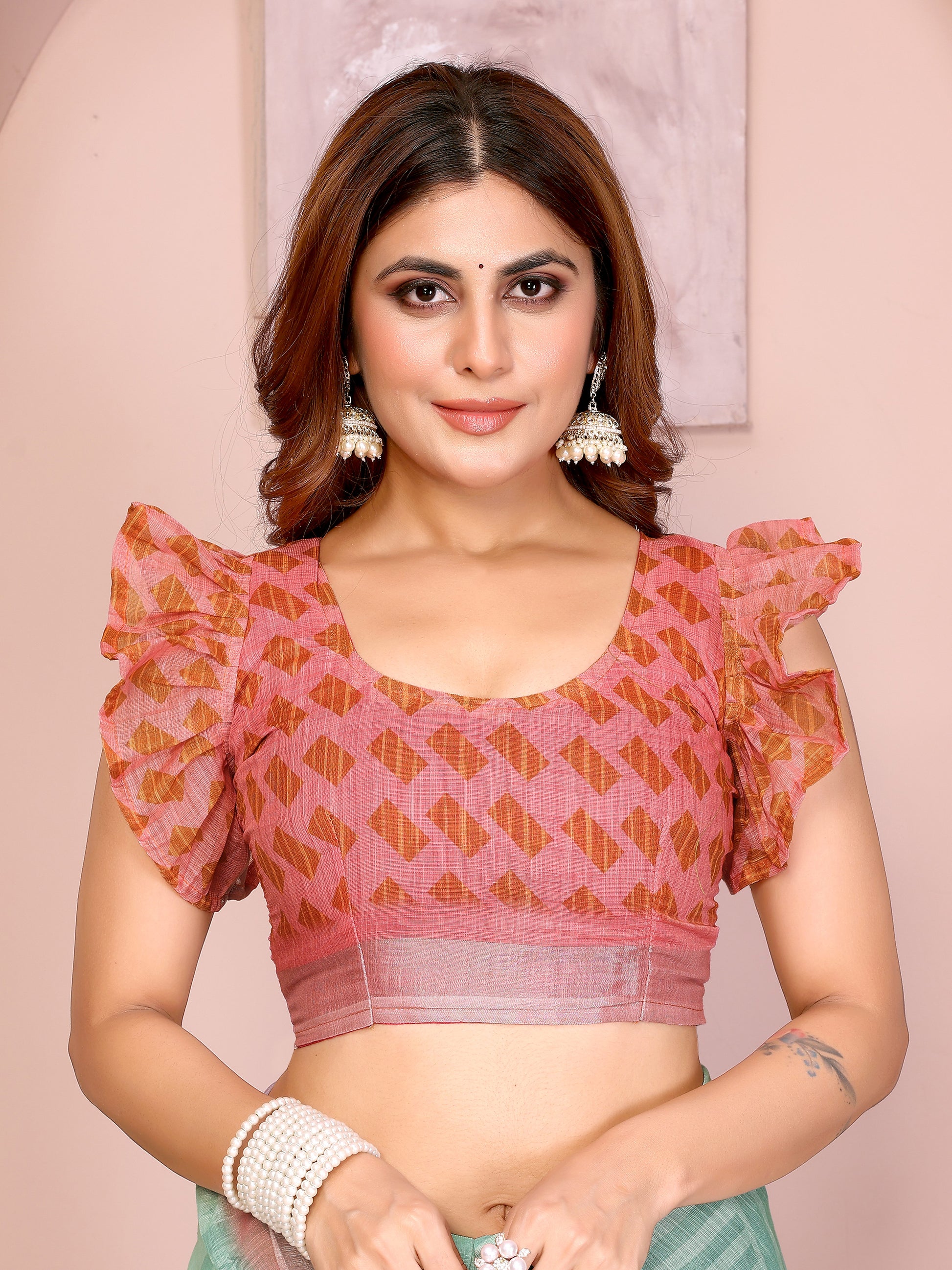 Refreshing Mint Green Linen Cotton Saree with Pink Floral Prints